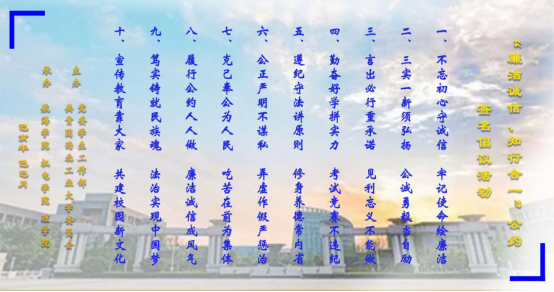 本次活动,在党委学生工作部和团委的指导下,由学生亲手拟定需要遵守的廉洁诚信十条公约,充分体现了我校学生对廉洁诚信的深刻认识。通过宣誓、签名倡议,不仅加深了同学们对廉洁诚信的理解,更有助于增强师生拒腐防变意识,促进校园廉政文化建设。