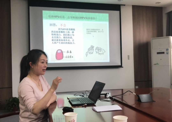 王志荣医师的宣讲主题是“宫颈癌疫苗的初识”,她用生动的案例介绍了宫颈癌的基本知识以及什么是HPV?什么是HPV疫苗的价?HPV的接种年龄以及适宜人群等HPV疫苗的相关知识。讲座结束后,王大夫热心地回答了大家关心的问题,交流讨论的气氛热烈。