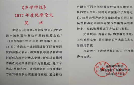 郭晓乐、杨坤德、马远良撰写的“浅海声速剖面与移动声源的跟踪定位”一文(《声学学报》,2017年第42卷第1期第1~13页)荣获该奖项。论文第2和通信作者探花视频