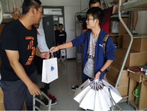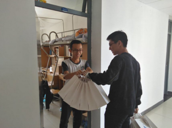 刚刚下课,学生会的负责同学就急忙前往新生宿舍,在云C宿舍一楼将礼物以班级为单位一一分好,等待18级班级负责人的到来。刚过十二点半,各班负责人就陆续前来领取本班礼物。同学们脸上洋溢着幸福的微笑,从学长和老师手中接过礼物并不停地说着感谢。对于不方便到达现场的女同学,学生会专门组织学姐将礼物送到了寝室内,并转达了学院对新生们的祝福,确保每位新生都能感受到来自学院的爱意。