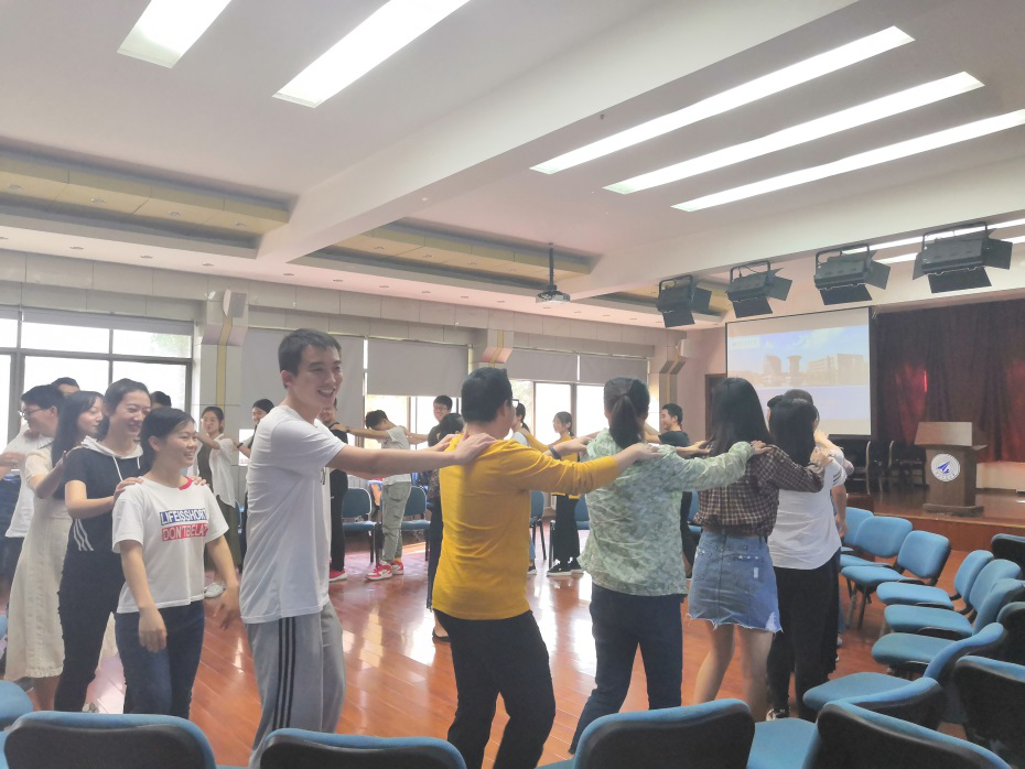 活动开始,陈莹老师为了让新生之间彼此能够更快的融入到集体中,组织大家进行了互相点名作自我介绍、抢凳子以及转圈肩膀按摩等活动,原本彼此生疏拘谨的新生们渐渐的放开了,现场的气氛也渐渐的轻松活跃了起来。