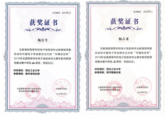 在校院两级教学研究与教师发展中心、《数字信号处理》、《数字图像处理》教学团队的大力支持和指导下,杨长生副教授、杨占龙副研究员在华西赛区预赛阶段脱颖而出入围全国决赛,最终分别荣获决赛二等奖。